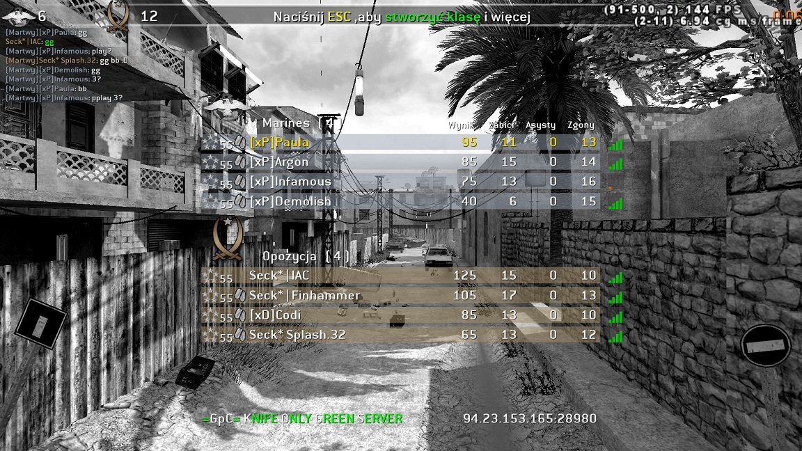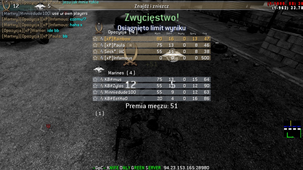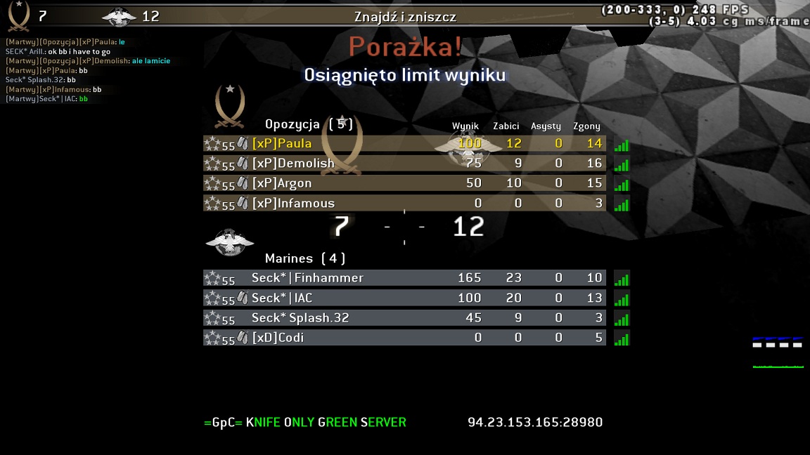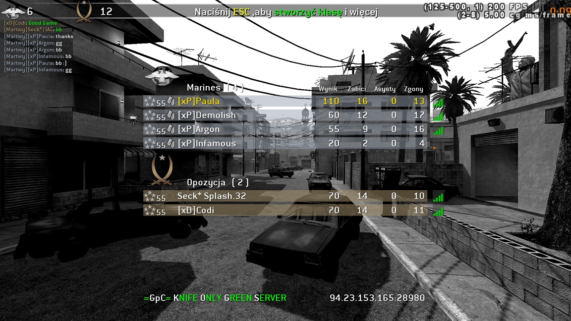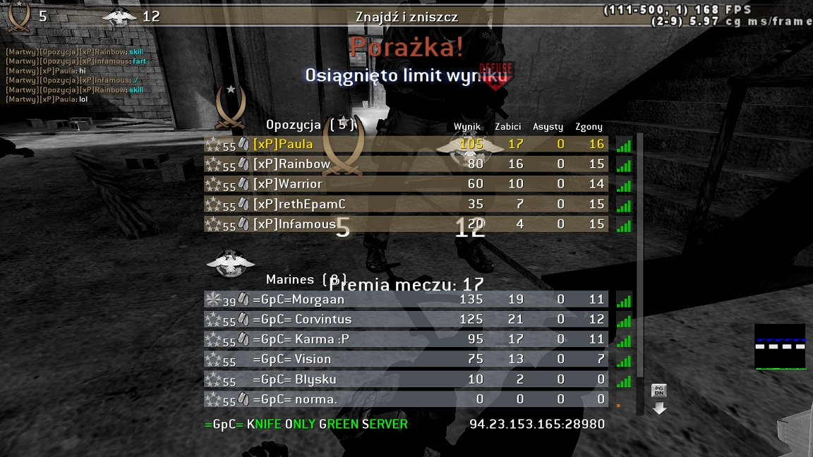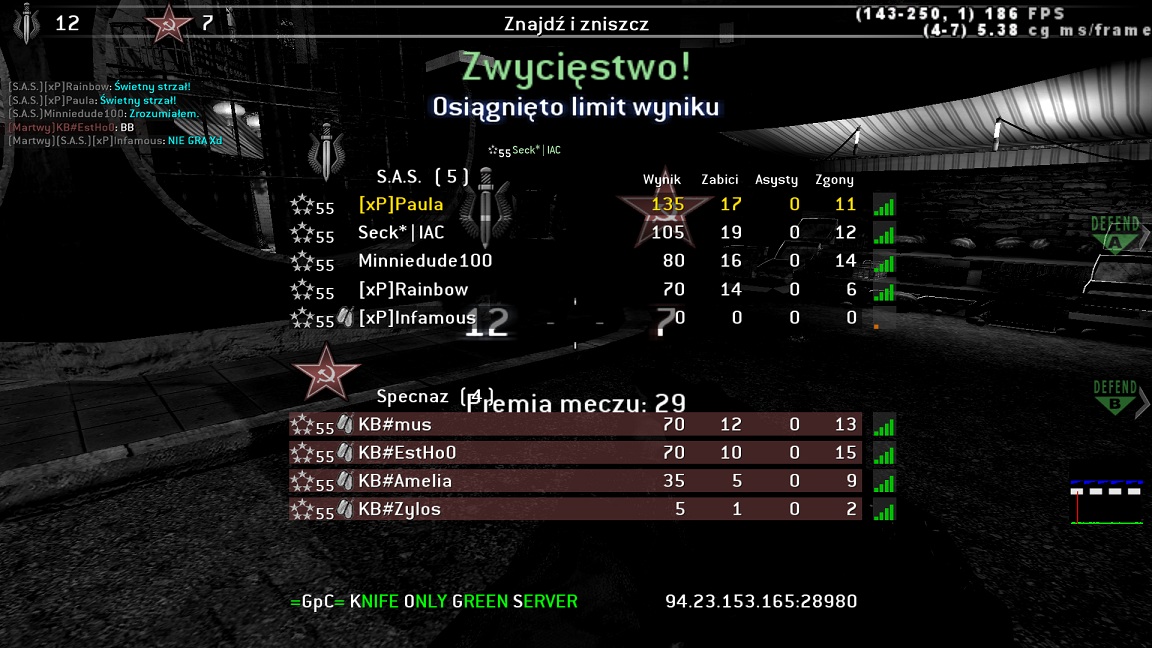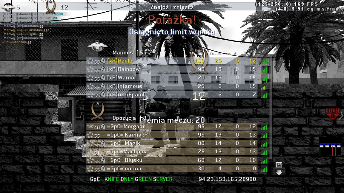 Witam Państwa serdecznie Pokrótce opiszę ostatnio zagrane wojny, zdecydowałam się wpierdzielić to wszystko do jednego newsa, bo po kolei to za dużo pisania jak dla mnie. A więc; cw z klanem Seck* Zapowiadałam, że ich zjedziemy, ale coś nam nie wyszło. Ograli nas do 6 na dwóch mapach, na jednej do 7... Załamka; z-a-ł-a-m-k-a; za-ła-mka. Tak serio to wyszłam z weny i nic mi się nie chcę pisać, więc wstawię po prostu wyniki: Wyniki: Showdown Backlot Strike Drugie cw; z GpC. Było jasne, że nie jesteśmy na to gotowi:p. Zawsze warto spróbować, hę? Zagraliśmy dwie mapy; obie zakończyły się dla nas wynikiem 5-12. Cóż, mogło być gorzej. GpC odziani blaskiem swojej świetności sprzedali nam kopa w dupę, co można zobaczyć niżej w wynikach.. Wyniki: Backlot Crash I ostatnie cw; z klanem KB. Na mixa wzięliśmy Iaca [Seck*], dziękuję stary grzybie;*<3. Dla KB zagrał Minniedude, który potem zastąpił naszego drogiego, całego zlagowanego Infamousa. Zagraliśmy dwie mapy, obie wygrane przez nas. I wyniki: Strike Chinatown ~Zajebiście dziękuję wszystkim za grę Paola