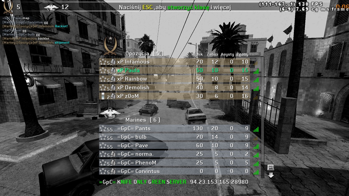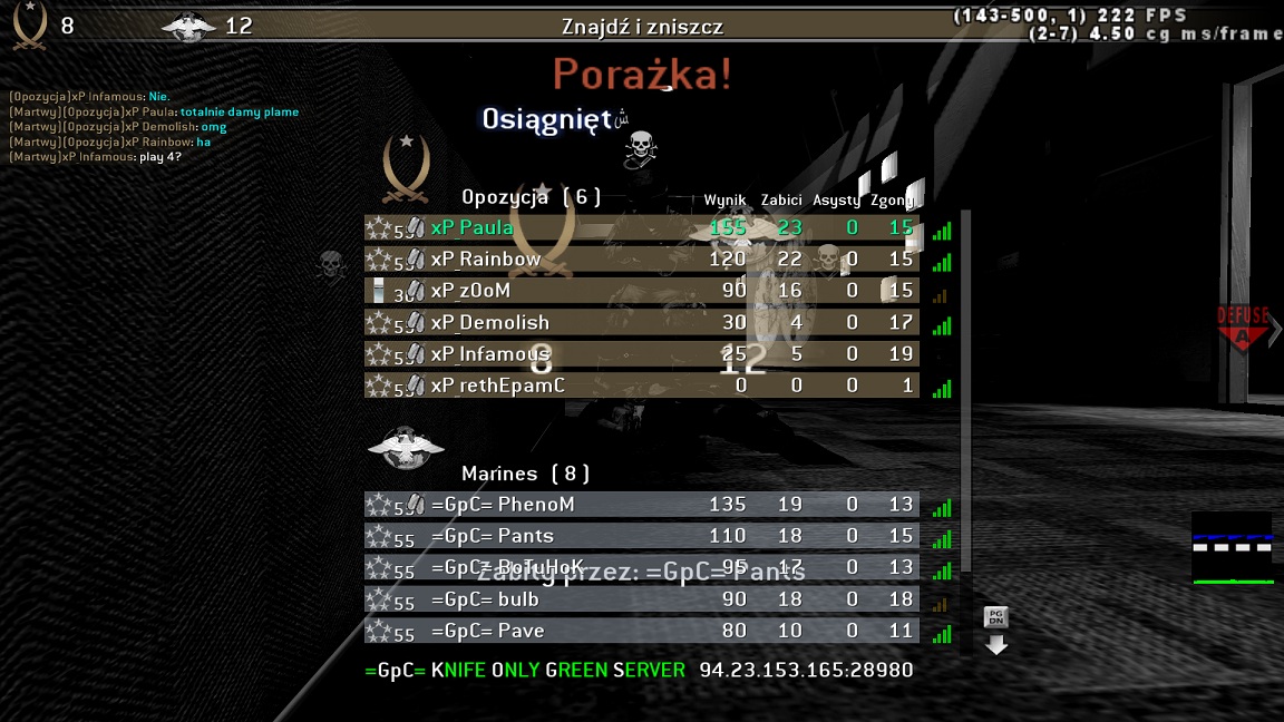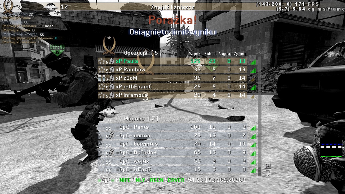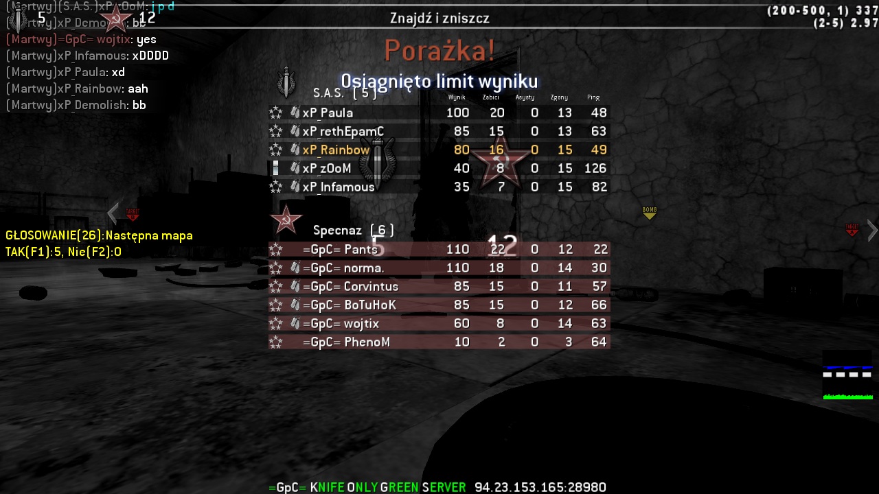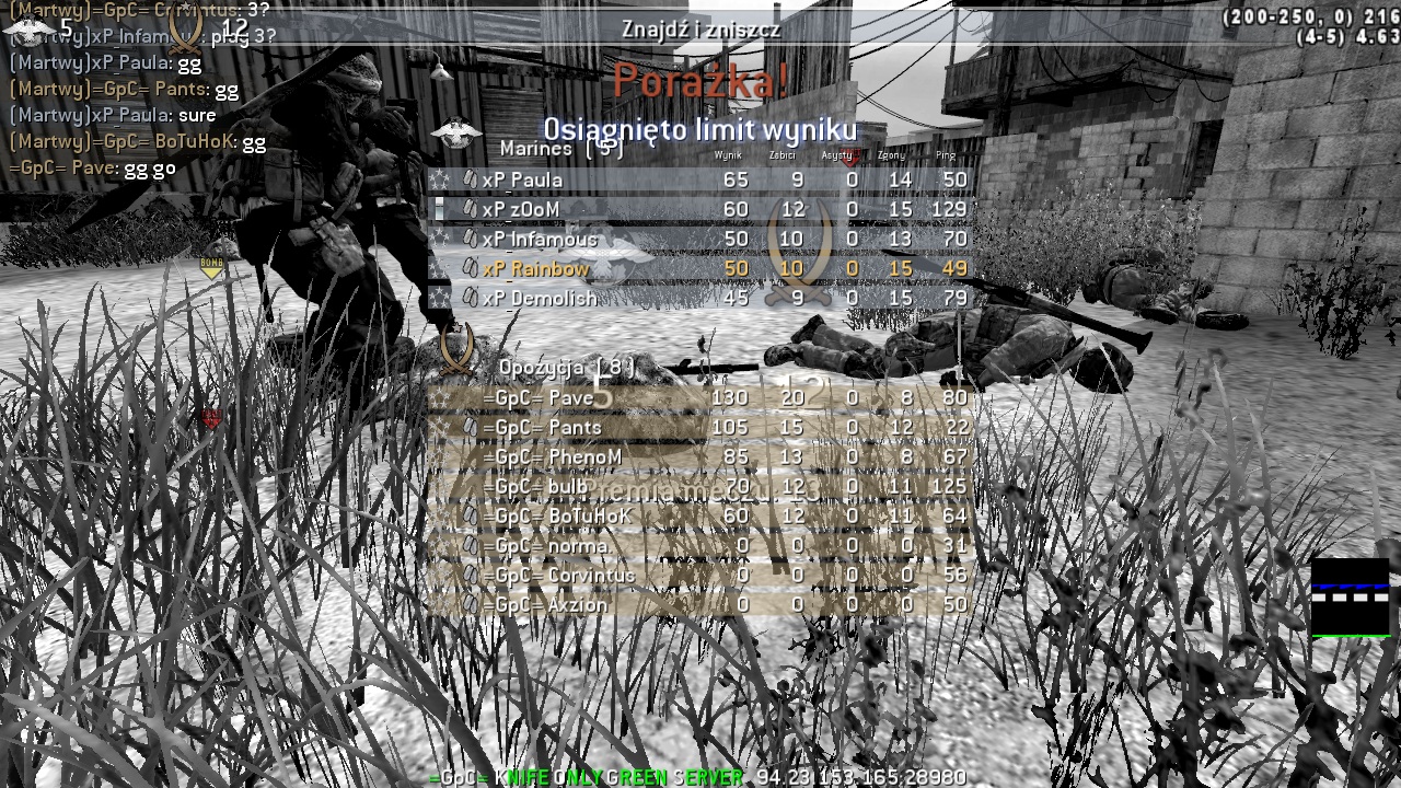 Zagraliśmy dziś wojnę ze społecznością =GpC=. Z sześciu map nie wygraliśmy żadnej xd. Zrzucę teraz winę na lagi naszych graczy, niskie fps`y, przeszkadzanie im przez rodziców, psy szczekające, koty biegające po klawiaturach i ogólny zamęt :D. Tak więc w tej przegranej nie mamy ani grama winy, jak widzicie. W sumie pomimo tego smutnego wyniku, fajnie mi się grało ;d. Ja z Rain`em robiłam za cały team, pff. Najlepszy wynik osiągnięty na mapie Broadcast [8:12], z czego jestem niezmiernie dumna, jest to bowiem najlepszy dotychczas osiągnięty wynik w wojnie z zajebistymi =GpC=. Grał w składzie po raz pierwszy cw z0oM. Dobrze Ci poszło, oby było tylko lepiej :). Dziękuję wszystkim za grę. I błagam moich graczy, aby trzymali się razem oraz nie biegli sami w chwilach odwagi, bo potem jest o jedną rundę mniej. Dziękuję, ~Paola WYNIKI: District Backlot Broadcast Vacant Crash