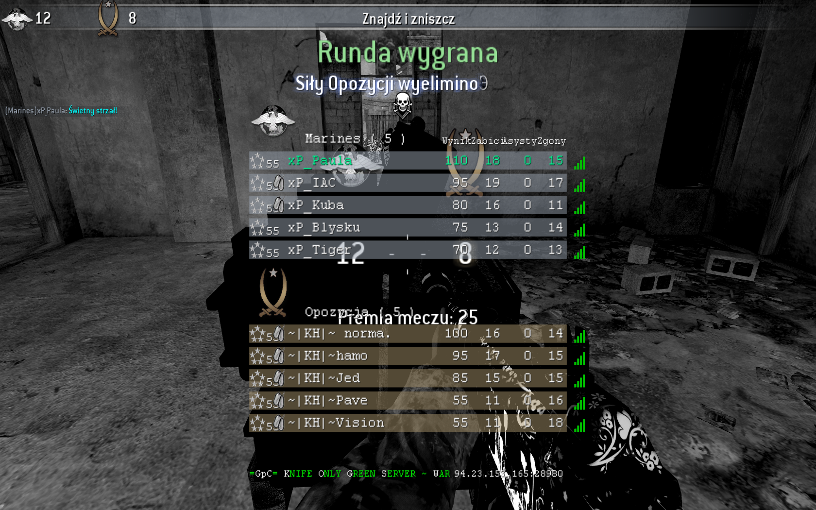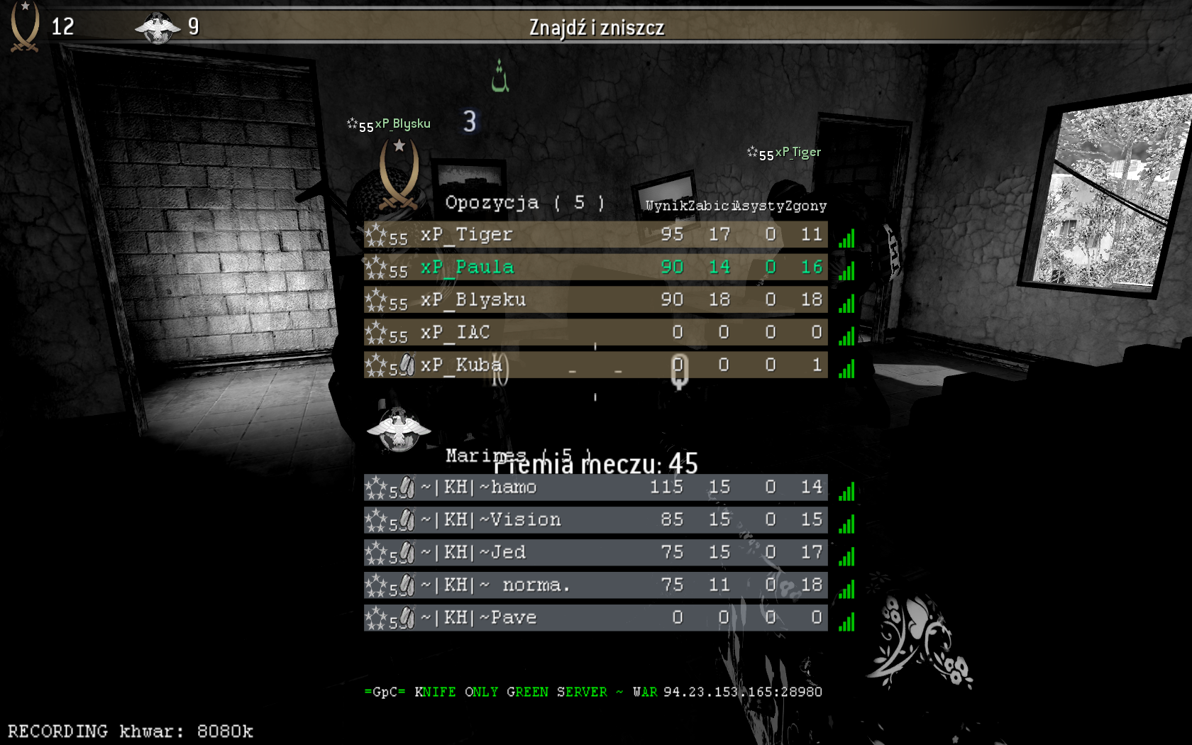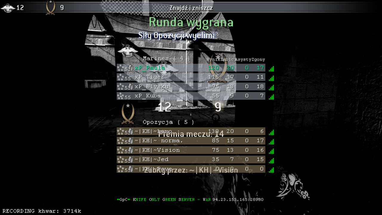 Some time ago we played a clan war with Knifing Hunters. We played three maps and won all of them. I'm kinda proud of us, for KH played experienced knifers like norma, Vision or hamo. Their new member, Jed, had really nice action on Backlot, he got 4 of us which really surprised me. Good job :).