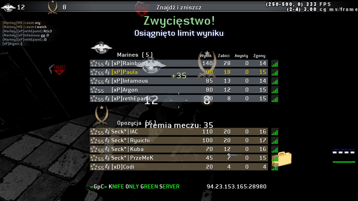 Siema buraki Jak możecie wywnioskować z powyższego obrazka zagraliśmy dzisiaj wojnę z klanem Seck*. Zagraliśmy trzy mapy, z czego... UWAGA... UWAGA... Uuuuwagaa... Wygraliśmy j e d n ą! Oo tak! Wygraliśmy aż jedną mapę, i to z jakim stylem. Chciałabym za to podziękować rodzicom, a w szczególności mamie i tacie. Ale największe podziękowania należą się Rain`owi, który podtrzymywał drużynę ;). Wyniki: Showdown Strike Vacant Dzięki ~Paola